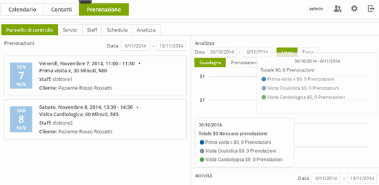 Il programma offre un grande pannello di analisi. È possibile visualizzare le prenotazioni, le entrate, il personale e le prestazioni di servizio con bellissimi grafici e widget dettagliate.
