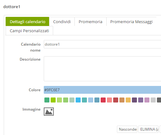Fare clic sull'icona per aprire le impostazioni del calendario. Qui è possibile gestire la condivisione, promemoria, messaggi di promemoria e campi personalizzati. Fare clic sull'icona miei calendari del widget calendari per raggiungere altre impostazioni del calendario. Qui è possibile modificare lo stato del calendario (privato / pubblico), vedere l'indirizzo delle risorse iCal e indirizzo rss.