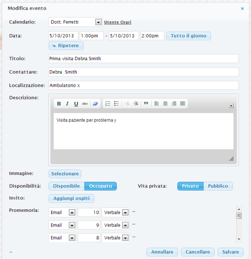 E' possibile invitare clienti o pazienti ai vostri eventi sia tramite email sia online su calendario pubblico